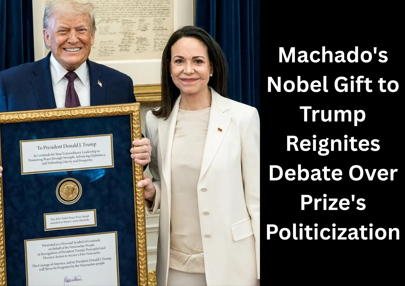 Venezuelan opposition leader and 2025 Nobel Peace Prize laureate María Corina Machado handed over her Nobel Peace Prize medal to U.S. President Donald Trump during a meeting at the White House on Thursday. The medal was mounted inside a large gold display frame with an inscription thanking Trump “on behalf of the Venezuelan people” for his role in supporting efforts to remove Nicolás Maduro from power.